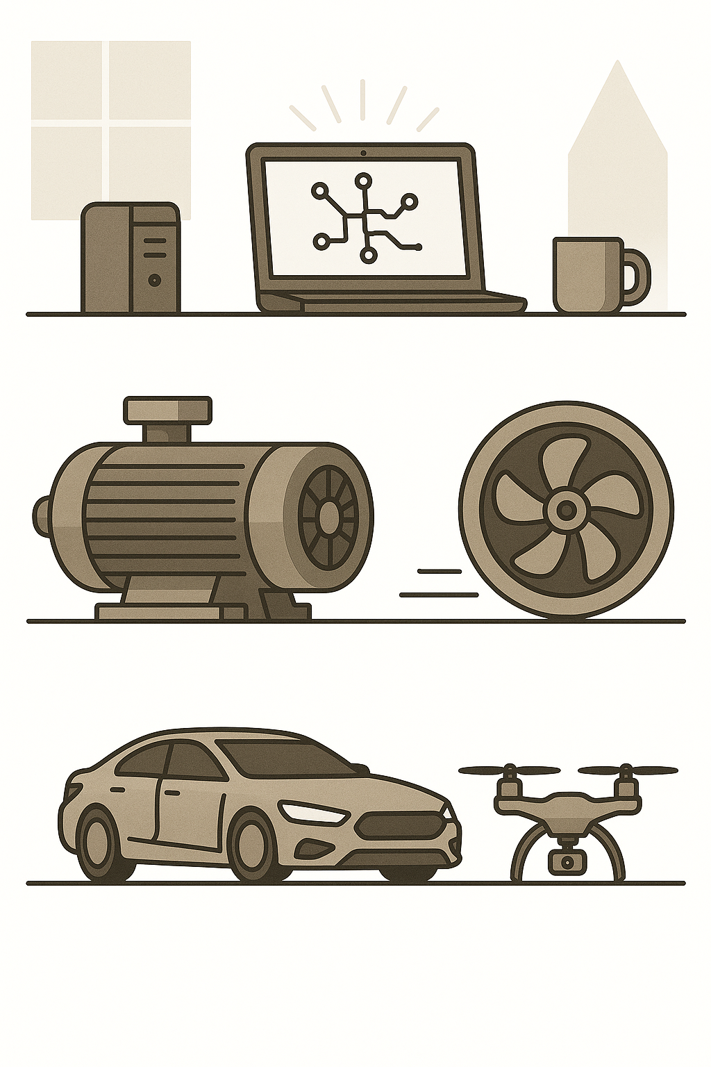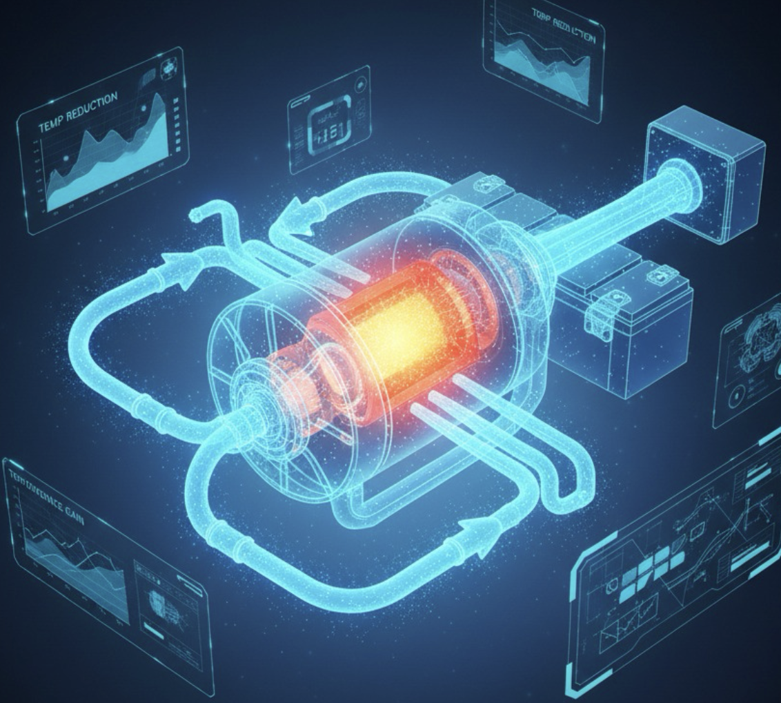 Turbo compressors, refrigerant-cooled motor design, CFD/FEA optimization.
